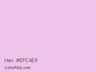 Hex #efc4e9 Color is a very light magenta color and the nearest color is French Lilac #ecc7ee. Hex code #efc4e9 and RGB value is rgb(239,196,233). In RGB color space, this color is composed of 94% red, 77% green, 91% blue, In CMYK color space, this color is composed of 0% cyan, 18% magenta, 3% yellow , 6% black , In HSL color space, this color has a hue angle of 308° , 57% saturation and 85% lightness.