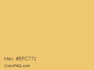 Hex #efc771 Color is a light orange color and the nearest color is Rob Roy #eac674. Hex code #efc771 and RGB value is rgb(239,199,113). In RGB color space, this color is composed of 94% red, 78% green, 44% blue, In CMYK color space, this color is composed of 0% cyan, 17% magenta, 53% yellow , 6% black , In HSL color space, this color has a hue angle of 41° , 80% saturation and 69% lightness.