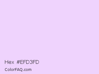Hex #efd3fd Color is a very light purple color and the nearest color is Pale Lavender #dcd0ff. Hex code #efd3fd and RGB value is rgb(239,211,253). In RGB color space, this color is composed of 94% red, 83% green, 99% blue, In CMYK color space, this color is composed of 6% cyan, 17% magenta, 0% yellow , 1% black , In HSL color space, this color has a hue angle of 280° , 91% saturation and 91% lightness.