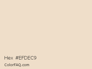 Hex #efdec9 Color is a very light orange color and the nearest color is Almond #efdecd. Hex code #efdec9 and RGB value is rgb(239,222,201). In RGB color space, this color is composed of 94% red, 87% green, 79% blue, In CMYK color space, this color is composed of 0% cyan, 7% magenta, 16% yellow , 6% black , In HSL color space, this color has a hue angle of 33° , 54% saturation and 86% lightness.