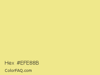 Hex #efe88b Color is a light yellow color and the nearest color is Khaki #f0e68c. Hex code #efe88b and RGB value is rgb(239,232,139). In RGB color space, this color is composed of 94% red, 91% green, 55% blue, In CMYK color space, this color is composed of 0% cyan, 3% magenta, 42% yellow , 6% black , In HSL color space, this color has a hue angle of 56° , 76% saturation and 74% lightness.