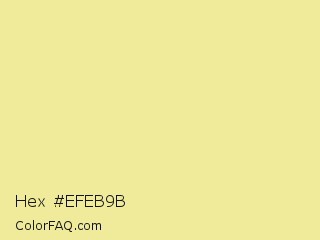 Hex #efeb9b Color is a light yellow color and the nearest color is Primrose #edea99. Hex code #efeb9b and RGB value is rgb(239,235,155). In RGB color space, this color is composed of 94% red, 92% green, 61% blue, In CMYK color space, this color is composed of 0% cyan, 2% magenta, 35% yellow , 6% black , In HSL color space, this color has a hue angle of 57° , 72% saturation and 77% lightness.