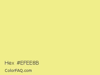 Hex #efee8b Color is a light yellow color and the nearest color is Sahara Sand #f1e788. Hex code #efee8b and RGB value is rgb(239,238,139). In RGB color space, this color is composed of 94% red, 93% green, 55% blue, In CMYK color space, this color is composed of 0% cyan, 0% magenta, 42% yellow , 6% black , In HSL color space, this color has a hue angle of 59° , 76% saturation and 74% lightness.