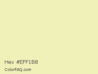 Hex #eff1b8 Color is a very light yellow color and the nearest color is Fall Green #ecebbd. Hex code #eff1b8 and RGB value is rgb(239,241,184). In RGB color space, this color is composed of 94% red, 95% green, 72% blue, In CMYK color space, this color is composed of 1% cyan, 0% magenta, 24% yellow , 5% black , In HSL color space, this color has a hue angle of 62° , 67% saturation and 83% lightness.