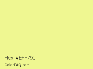 Hex #eff791 Color is a light yellow color and the nearest color is Key Lime #e8f48c. Hex code #eff791 and RGB value is rgb(239,247,145). In RGB color space, this color is composed of 94% red, 97% green, 57% blue, In CMYK color space, this color is composed of 3% cyan, 0% magenta, 41% yellow , 3% black , In HSL color space, this color has a hue angle of 65° , 86% saturation and 77% lightness.