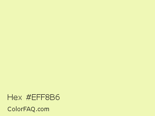 Hex #eff8b6 Color is a very light yellow color and the nearest color is Tidal #f1ffad. Hex code #eff8b6 and RGB value is rgb(239,248,182). In RGB color space, this color is composed of 94% red, 97% green, 71% blue, In CMYK color space, this color is composed of 4% cyan, 0% magenta, 27% yellow , 3% black , In HSL color space, this color has a hue angle of 68° , 83% saturation and 84% lightness.