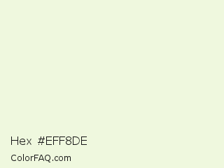 Hex #eff8de Color is a very light green color and the nearest color is Frost #edf5dd. Hex code #eff8de and RGB value is rgb(239,248,222). In RGB color space, this color is composed of 94% red, 97% green, 87% blue, In CMYK color space, this color is composed of 4% cyan, 0% magenta, 10% yellow , 3% black , In HSL color space, this color has a hue angle of 81° , 65% saturation and 92% lightness.