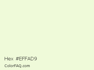 Hex #effad9 Color is a very light green color and the nearest color is Orinoco #f3fbd4. Hex code #effad9 and RGB value is rgb(239,250,217). In RGB color space, this color is composed of 94% red, 98% green, 85% blue, In CMYK color space, this color is composed of 4% cyan, 0% magenta, 13% yellow , 2% black , In HSL color space, this color has a hue angle of 80° , 77% saturation and 92% lightness.