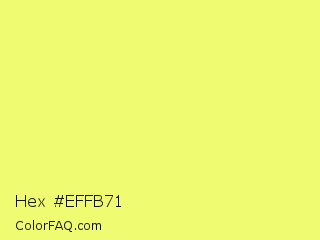 Hex #effb71 Color is a light yellow color and the nearest color is Sunny #f2f27a. Hex code #effb71 and RGB value is rgb(239,251,113). In RGB color space, this color is composed of 94% red, 98% green, 44% blue, In CMYK color space, this color is composed of 5% cyan, 0% magenta, 55% yellow , 2% black , In HSL color space, this color has a hue angle of 65° , 95% saturation and 71% lightness.