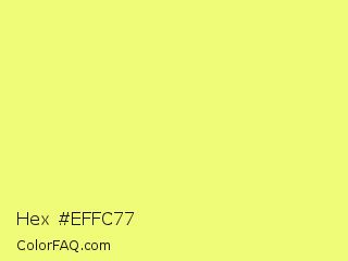 Hex #effc77 Color is a light yellow color and the nearest color is Sunny #f2f27a. Hex code #effc77 and RGB value is rgb(239,252,119). In RGB color space, this color is composed of 94% red, 99% green, 47% blue, In CMYK color space, this color is composed of 5% cyan, 0% magenta, 53% yellow , 1% black , In HSL color space, this color has a hue angle of 66° , 96% saturation and 73% lightness.