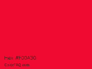 Hex #f00a30 Color is a normal red color and the nearest color is Torch Red #fd0e35. Hex code #f00a30 and RGB value is rgb(240,10,48). In RGB color space, this color is composed of 94% red, 4% green, 19% blue, In CMYK color space, this color is composed of 0% cyan, 96% magenta, 80% yellow , 6% black , In HSL color space, this color has a hue angle of 350° , 92% saturation and 49% lightness.