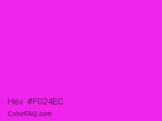 Hex #f024ec Color is a normal magenta color and the nearest color is Hot Magenta #ff1dce. Hex code #f024ec and RGB value is rgb(240,36,236). In RGB color space, this color is composed of 94% red, 14% green, 93% blue, In CMYK color space, this color is composed of 0% cyan, 85% magenta, 2% yellow , 6% black , In HSL color space, this color has a hue angle of 301° , 87% saturation and 54% lightness.