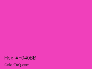 Hex #f040bb Color is a normal magenta color and the nearest color is Frostbite #e936a7. Hex code #f040bb and RGB value is rgb(240,64,187). In RGB color space, this color is composed of 94% red, 25% green, 73% blue, In CMYK color space, this color is composed of 0% cyan, 73% magenta, 22% yellow , 6% black , In HSL color space, this color has a hue angle of 318° , 85% saturation and 60% lightness.