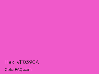 Hex #f059ca Color is a light magenta color and the nearest color is Light Deep Pink #ff5ccd. Hex code #f059ca and RGB value is rgb(240,89,202). In RGB color space, this color is composed of 94% red, 35% green, 79% blue, In CMYK color space, this color is composed of 0% cyan, 63% magenta, 16% yellow , 6% black , In HSL color space, this color has a hue angle of 315° , 83% saturation and 65% lightness.