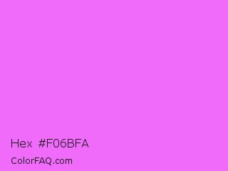 Hex #f06bfa Color is a light magenta color and the nearest color is Pink Flamingo #fc74fd. Hex code #f06bfa and RGB value is rgb(240,107,250). In RGB color space, this color is composed of 94% red, 42% green, 98% blue, In CMYK color space, this color is composed of 4% cyan, 57% magenta, 0% yellow , 2% black , In HSL color space, this color has a hue angle of 296° , 93% saturation and 70% lightness.
