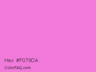 Hex #f079da Color is a light magenta color and the nearest color is Pale Magenta #f984e5. Hex code #f079da and RGB value is rgb(240,121,218). In RGB color space, this color is composed of 94% red, 47% green, 85% blue, In CMYK color space, this color is composed of 0% cyan, 50% magenta, 9% yellow , 6% black , In HSL color space, this color has a hue angle of 311° , 80% saturation and 71% lightness.