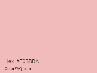 Hex #f0bbba Color is a very light red color and the nearest color is Beauty Bush #eec1be. Hex code #f0bbba and RGB value is rgb(240,187,186). In RGB color space, this color is composed of 94% red, 73% green, 73% blue, In CMYK color space, this color is composed of 0% cyan, 22% magenta, 23% yellow , 6% black , In HSL color space, this color has a hue angle of 1° , 64% saturation and 84% lightness.