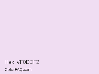 Hex #f0ddf2 Color is a very light magenta color and the nearest color is Prim #f0e2ec. Hex code #f0ddf2 and RGB value is rgb(240,221,242). In RGB color space, this color is composed of 94% red, 87% green, 95% blue, In CMYK color space, this color is composed of 1% cyan, 9% magenta, 0% yellow , 5% black , In HSL color space, this color has a hue angle of 294° , 45% saturation and 91% lightness.