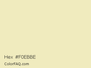 Hex #f0ebbe Color is a very light yellow color and the nearest color is Fall Green #ecebbd. Hex code #f0ebbe and RGB value is rgb(240,235,190). In RGB color space, this color is composed of 94% red, 92% green, 75% blue, In CMYK color space, this color is composed of 0% cyan, 2% magenta, 21% yellow , 6% black , In HSL color space, this color has a hue angle of 54° , 63% saturation and 84% lightness.
