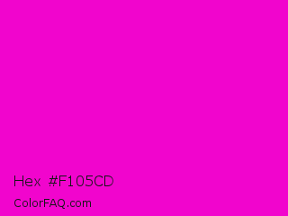 Hex #f105cd Color is a normal magenta color and the nearest color is Purple Pizzazz #ff00cc. Hex code #f105cd and RGB value is rgb(241,5,205). In RGB color space, this color is composed of 95% red, 2% green, 80% blue, In CMYK color space, this color is composed of 0% cyan, 98% magenta, 15% yellow , 5% black , In HSL color space, this color has a hue angle of 309° , 96% saturation and 48% lightness.