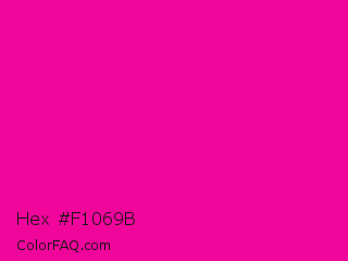 Hex #f1069b Color is a normal magenta color and the nearest color is Hollywood Cerise #f400a1. Hex code #f1069b and RGB value is rgb(241,6,155). In RGB color space, this color is composed of 95% red, 2% green, 61% blue, In CMYK color space, this color is composed of 0% cyan, 98% magenta, 36% yellow , 5% black , In HSL color space, this color has a hue angle of 322° , 95% saturation and 48% lightness.