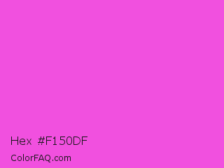 Hex #f150df Color is a light magenta color and the nearest color is Purple Pizzazz #fe4eda. Hex code #f150df and RGB value is rgb(241,80,223). In RGB color space, this color is composed of 95% red, 31% green, 87% blue, In CMYK color space, this color is composed of 0% cyan, 67% magenta, 7% yellow , 5% black , In HSL color space, this color has a hue angle of 307° , 85% saturation and 63% lightness.