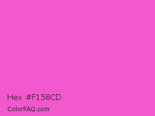 Hex #f158cd Color is a light magenta color and the nearest color is Light Deep Pink #ff5ccd. Hex code #f158cd and RGB value is rgb(241,88,205). In RGB color space, this color is composed of 95% red, 35% green, 80% blue, In CMYK color space, this color is composed of 0% cyan, 63% magenta, 15% yellow , 5% black , In HSL color space, this color has a hue angle of 314° , 85% saturation and 65% lightness.