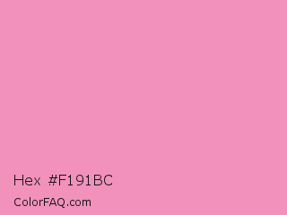 Hex #f191bc Color is a light rose color and the nearest color is Amaranth Pink #f19cbb. Hex code #f191bc and RGB value is rgb(241,145,188). In RGB color space, this color is composed of 95% red, 57% green, 74% blue, In CMYK color space, this color is composed of 0% cyan, 40% magenta, 22% yellow , 5% black , In HSL color space, this color has a hue angle of 333° , 77% saturation and 76% lightness.
