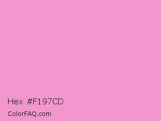 Hex #f197cd Color is a light magenta color and the nearest color is Pastel Magenta #f49ac2. Hex code #f197cd and RGB value is rgb(241,151,205). In RGB color space, this color is composed of 95% red, 59% green, 80% blue, In CMYK color space, this color is composed of 0% cyan, 37% magenta, 15% yellow , 5% black , In HSL color space, this color has a hue angle of 324° , 76% saturation and 77% lightness.