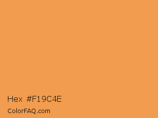 Hex #f19c4e Color is a light orange color and the nearest color is Tan Hide #fa9d5a. Hex code #f19c4e and RGB value is rgb(241,156,78). In RGB color space, this color is composed of 95% red, 61% green, 31% blue, In CMYK color space, this color is composed of 0% cyan, 35% magenta, 68% yellow , 5% black , In HSL color space, this color has a hue angle of 29° , 85% saturation and 63% lightness.