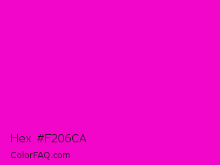 Hex #f206ca Color is a normal magenta color and the nearest color is Purple Pizzazz #ff00cc. Hex code #f206ca and RGB value is rgb(242,6,202). In RGB color space, this color is composed of 95% red, 2% green, 79% blue, In CMYK color space, this color is composed of 0% cyan, 98% magenta, 17% yellow , 5% black , In HSL color space, this color has a hue angle of 310° , 95% saturation and 49% lightness.