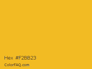 Hex #f2bb23 Color is a normal orange color and the nearest color is Lightning Yellow #fcc01e. Hex code #f2bb23 and RGB value is rgb(242,187,35). In RGB color space, this color is composed of 95% red, 73% green, 14% blue, In CMYK color space, this color is composed of 0% cyan, 23% magenta, 86% yellow , 5% black , In HSL color space, this color has a hue angle of 44° , 89% saturation and 54% lightness.