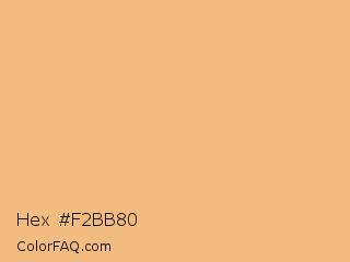 Hex #f2bb80 Color is a light orange color and the nearest color is Tacao #edb381. Hex code #f2bb80 and RGB value is rgb(242,187,128). In RGB color space, this color is composed of 95% red, 73% green, 50% blue, In CMYK color space, this color is composed of 0% cyan, 23% magenta, 47% yellow , 5% black , In HSL color space, this color has a hue angle of 31° , 81% saturation and 73% lightness.
