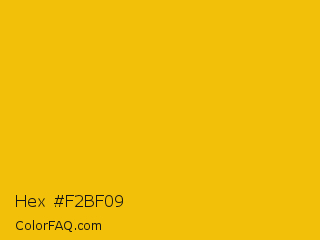 Hex #f2bf09 Color is a normal yellow color and the nearest color is Corn #e7bf05. Hex code #f2bf09 and RGB value is rgb(242,191,9). In RGB color space, this color is composed of 95% red, 75% green, 4% blue, In CMYK color space, this color is composed of 0% cyan, 21% magenta, 96% yellow , 5% black , In HSL color space, this color has a hue angle of 47° , 93% saturation and 49% lightness.