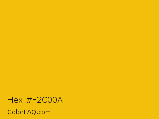 Hex #f2c00a Color is a normal yellow color and the nearest color is Corn #e7bf05. Hex code #f2c00a and RGB value is rgb(242,192,10). In RGB color space, this color is composed of 95% red, 75% green, 4% blue, In CMYK color space, this color is composed of 0% cyan, 21% magenta, 96% yellow , 5% black , In HSL color space, this color has a hue angle of 47° , 92% saturation and 49% lightness.