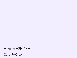 Hex #f2edff Color is a almost white indigo color and the nearest color is Titan White #f0eeff. Hex code #f2edff and RGB value is rgb(242,237,255). In RGB color space, this color is composed of 95% red, 93% green, 100% blue, In CMYK color space, this color is composed of 5% cyan, 7% magenta, 0% yellow , 0% black , In HSL color space, this color has a hue angle of 257° , 100% saturation and 96% lightness.