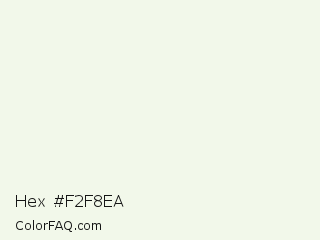 Hex #f2f8ea Color is a almost white green color and the nearest color is Feta #f0fcea. Hex code #f2f8ea and RGB value is rgb(242,248,234). In RGB color space, this color is composed of 95% red, 97% green, 92% blue, In CMYK color space, this color is composed of 2% cyan, 0% magenta, 6% yellow , 3% black , In HSL color space, this color has a hue angle of 86° , 50% saturation and 95% lightness.