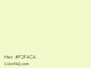 Hex #f2faca Color is a very light yellow color and the nearest color is Chiffon #f1ffc8. Hex code #f2faca and RGB value is rgb(242,250,202). In RGB color space, this color is composed of 95% red, 98% green, 79% blue, In CMYK color space, this color is composed of 3% cyan, 0% magenta, 19% yellow , 2% black , In HSL color space, this color has a hue angle of 70° , 83% saturation and 89% lightness.