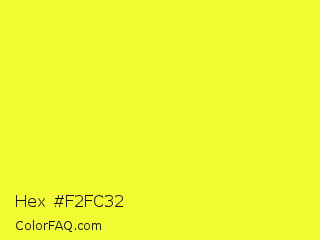 Hex #f2fc32 Color is a normal yellow color and the nearest color is Maximum Yellow #fafa37. Hex code #f2fc32 and RGB value is rgb(242,252,50). In RGB color space, this color is composed of 95% red, 99% green, 20% blue, In CMYK color space, this color is composed of 4% cyan, 0% magenta, 80% yellow , 1% black , In HSL color space, this color has a hue angle of 63° , 97% saturation and 59% lightness.