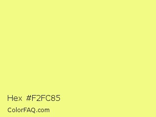 Hex #f2fc85 Color is a light yellow color and the nearest color is Honeysuckle #edfc84. Hex code #f2fc85 and RGB value is rgb(242,252,133). In RGB color space, this color is composed of 95% red, 99% green, 52% blue, In CMYK color space, this color is composed of 4% cyan, 0% magenta, 47% yellow , 1% black , In HSL color space, this color has a hue angle of 65° , 95% saturation and 75% lightness.