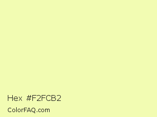 Hex #f2fcb2 Color is a very light yellow color and the nearest color is Tidal #f1ffad. Hex code #f2fcb2 and RGB value is rgb(242,252,178). In RGB color space, this color is composed of 95% red, 99% green, 70% blue, In CMYK color space, this color is composed of 4% cyan, 0% magenta, 29% yellow , 1% black , In HSL color space, this color has a hue angle of 68° , 93% saturation and 84% lightness.