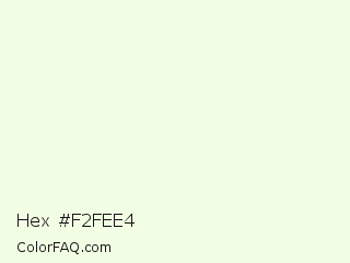 Hex #f2fee4 Color is a almost white green color and the nearest color is Rice Flower #eeffe2. Hex code #f2fee4 and RGB value is rgb(242,254,228). In RGB color space, this color is composed of 95% red, 100% green, 89% blue, In CMYK color space, this color is composed of 5% cyan, 0% magenta, 10% yellow , 0% black , In HSL color space, this color has a hue angle of 88° , 93% saturation and 95% lightness.