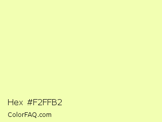 Hex #f2ffb2 Color is a very light yellow color and the nearest color is Tidal #f1ffad. Hex code #f2ffb2 and RGB value is rgb(242,255,178). In RGB color space, this color is composed of 95% red, 100% green, 70% blue, In CMYK color space, this color is composed of 5% cyan, 0% magenta, 30% yellow , 0% black , In HSL color space, this color has a hue angle of 70° , 100% saturation and 85% lightness.