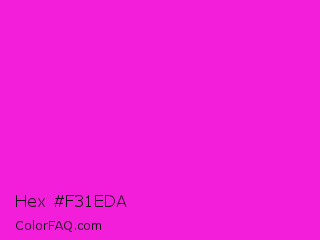 Hex #f31eda Color is a normal magenta color and the nearest color is Hot Magenta #ff1dce. Hex code #f31eda and RGB value is rgb(243,30,218). In RGB color space, this color is composed of 95% red, 12% green, 85% blue, In CMYK color space, this color is composed of 0% cyan, 88% magenta, 10% yellow , 5% black , In HSL color space, this color has a hue angle of 307° , 90% saturation and 54% lightness.