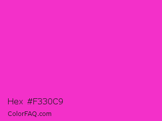 Hex #f330c9 Color is a normal magenta color and the nearest color is Razzle Dazzle Rose #ff33cc. Hex code #f330c9 and RGB value is rgb(243,48,201). In RGB color space, this color is composed of 95% red, 19% green, 79% blue, In CMYK color space, this color is composed of 0% cyan, 80% magenta, 17% yellow , 5% black , In HSL color space, this color has a hue angle of 313° , 89% saturation and 57% lightness.