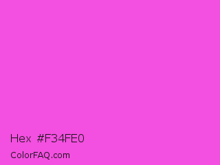 Hex #f34fe0 Color is a light magenta color and the nearest color is Purple Pizzazz #fe4eda. Hex code #f34fe0 and RGB value is rgb(243,79,224). In RGB color space, this color is composed of 95% red, 31% green, 88% blue, In CMYK color space, this color is composed of 0% cyan, 67% magenta, 8% yellow , 5% black , In HSL color space, this color has a hue angle of 307° , 87% saturation and 63% lightness.
