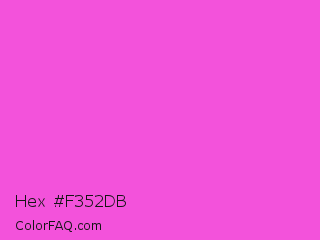 Hex #f352db Color is a light magenta color and the nearest color is Purple Pizzazz #fe4eda. Hex code #f352db and RGB value is rgb(243,82,219). In RGB color space, this color is composed of 95% red, 32% green, 86% blue, In CMYK color space, this color is composed of 0% cyan, 66% magenta, 10% yellow , 5% black , In HSL color space, this color has a hue angle of 309° , 87% saturation and 64% lightness.