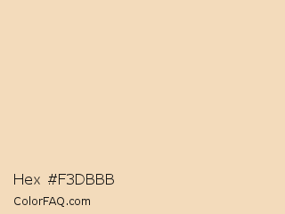 Hex #f3dbbb Color is a very light orange color and the nearest color is Dutch White #efdfbb. Hex code #f3dbbb and RGB value is rgb(243,219,187). In RGB color space, this color is composed of 95% red, 86% green, 73% blue, In CMYK color space, this color is composed of 0% cyan, 10% magenta, 23% yellow , 5% black , In HSL color space, this color has a hue angle of 34° , 70% saturation and 84% lightness.