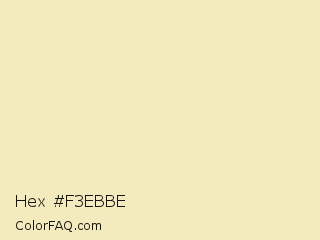 Hex #f3ebbe Color is a very light yellow color and the nearest color is Lemon Meringue #f6eabe. Hex code #f3ebbe and RGB value is rgb(243,235,190). In RGB color space, this color is composed of 95% red, 92% green, 75% blue, In CMYK color space, this color is composed of 0% cyan, 3% magenta, 22% yellow , 5% black , In HSL color space, this color has a hue angle of 51° , 69% saturation and 85% lightness.