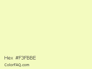 Hex #f3fbbe Color is a very light yellow color and the nearest color is Australian Mint #f5ffbe. Hex code #f3fbbe and RGB value is rgb(243,251,190). In RGB color space, this color is composed of 95% red, 98% green, 75% blue, In CMYK color space, this color is composed of 3% cyan, 0% magenta, 24% yellow , 2% black , In HSL color space, this color has a hue angle of 68° , 88% saturation and 86% lightness.